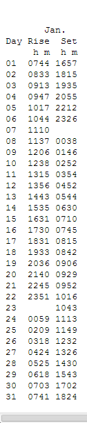 riseset = sunrise.Moon(20, 4, 2013, lat, lng, -06)