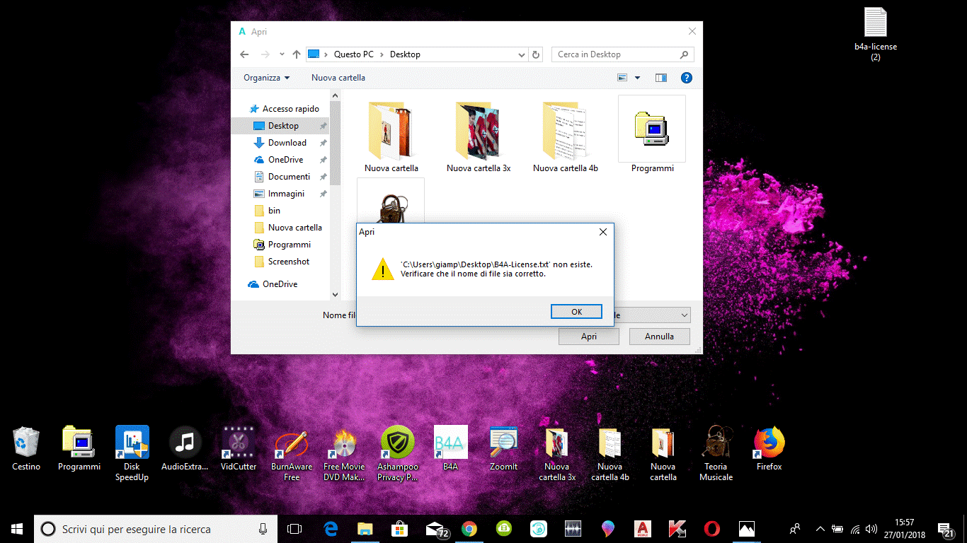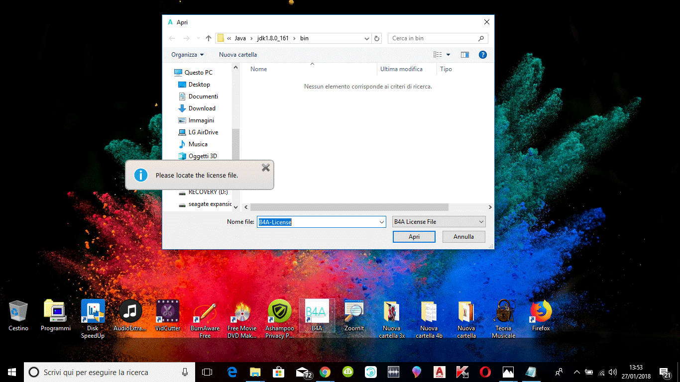 Intanto grazie per la risposta, ho provato già a disinstallare la versione trial e ad installare solo quella nuova ma non ho risolto, vi spiego meglio: le istruzioni allegate alla mail per l'upgrade dicevano di installare prima la versione completa (infatti all'uopo c'era il link sulla mail), una volta fatto questo bisognava aprire questa versione completa ed eseguire due step: 1) inserire in essa un file.txt (allegato sempre alla mail e che bisognava salvare sul desktop); 2) riaprirla di nuovo e in automatico essa mi avrebbe richiesto di inserire la mia mail, con la quale mi ero registrato sul sito, ma questo non è avvenuto! In pratica, solo il primo step è andato a buon fine (si fa per dire!) perché il file.txt l'ha preso ma tutto è rimasto come prima, se vado su B4A e apro "informazioni prodotto", mi dice ancora: "versione trial"! Ma poi tutte le istruzioni per l'upgrade sono confusionarie! Nella mail c'era scritto che il file allegato non era un file di testo e non bisognava aprirlo ma in realtà, una volta scaricato e salvato sul desktop, si leggeva benissimo: "file.txt" e "license", poi il file era rappresentato da una sfilza lunghissima di ideogrammi... o cinesi, o coreani, o giapponesi... boh?! Che ne so?! Un'altra cosa strana: loro dicevano che non bisognava aprirlo ma di scrivere (dove? Boh?! non lo precisavano!) la mia mail! Poi, dopo il primo step, una volta riaperta la versione completa di B4A, in automatico essa mi avrebbe richiesto questo nuovo file di testo con la mia mail, cosa che non è avvenuta! Mi scuso con tutti se non sono stato abbastanza chiaro, se volete vi posto delle foto di questa mail confusionaria... vi assicuro che sto uscendo di testa per capire queste istruzioni, non è così semplice questo upgrade! Se avete pazienza aiutatemi, grazie!