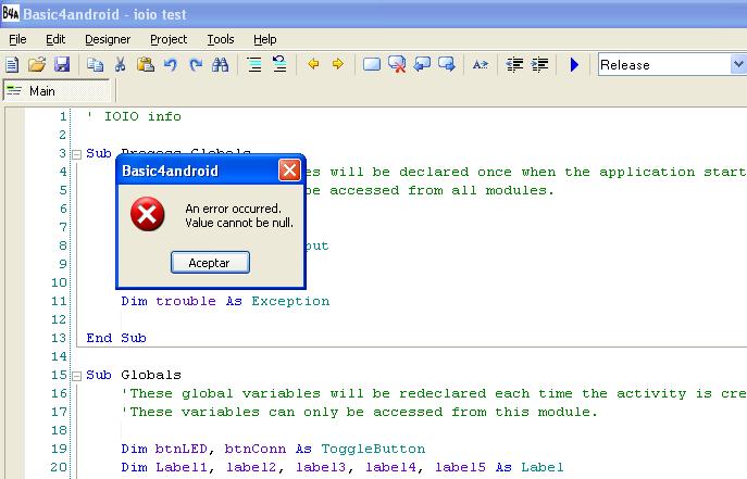 Before I realized the device b4a_bridge needed to be running before I started the IDE connection, I was getting the same error.