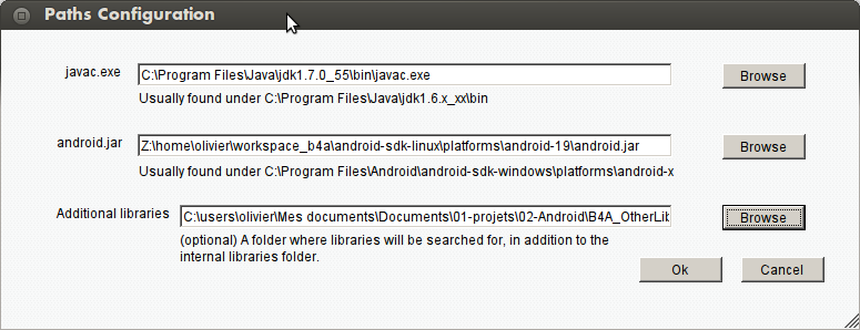 Just one question: when I try to 'Tools -> Configure Paths' in B4A (needed in order to compile an app), I need to browse for javac.exe but Ubuntu's Dash couldn't find it. However, AFAIK I don't think that it is available since Linux version of OpenJDK rather than Windows version of Java is installed. Any suggestions as to where to find javac.exe? I wondered if the Windows version of Java needs to be installed?