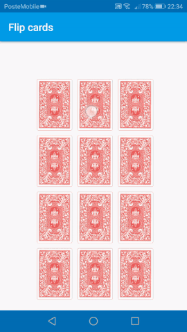 Second, as each card implements its own rotation and keep track of its angles, cards can spin together without any side effect. I have altered the rotate function so that it accepts a parameter (number of rotations required). It’s therefore possible to have the 12 cards rotating at the same time, but it’s rather slow in Debug mode, but fast in release mode.