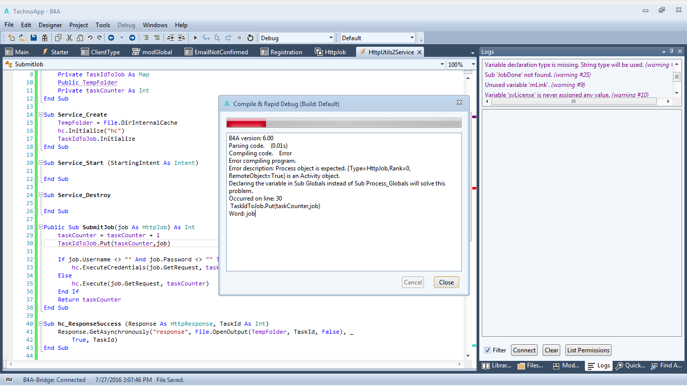 Hi , please can you see my attached error. I copied the HttpJob class and HttpUtils2Service service to my project. Its first B4A project/android project im working on. Can anyone please explain to what the problem is and/or how to fix it .... See attached img. Thank You