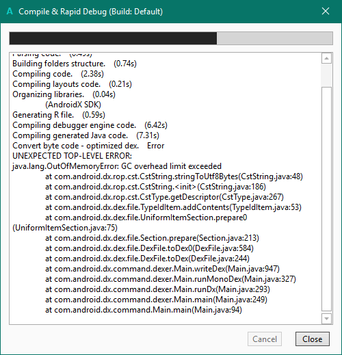This error raises after about 1 or two minutes in the step "optimized dex" and I think that it's something related with the updates. I think that this is definitely a problem with B4A framework with the new Androd X updated... @Erel , do you have something like this happening? How to fix?