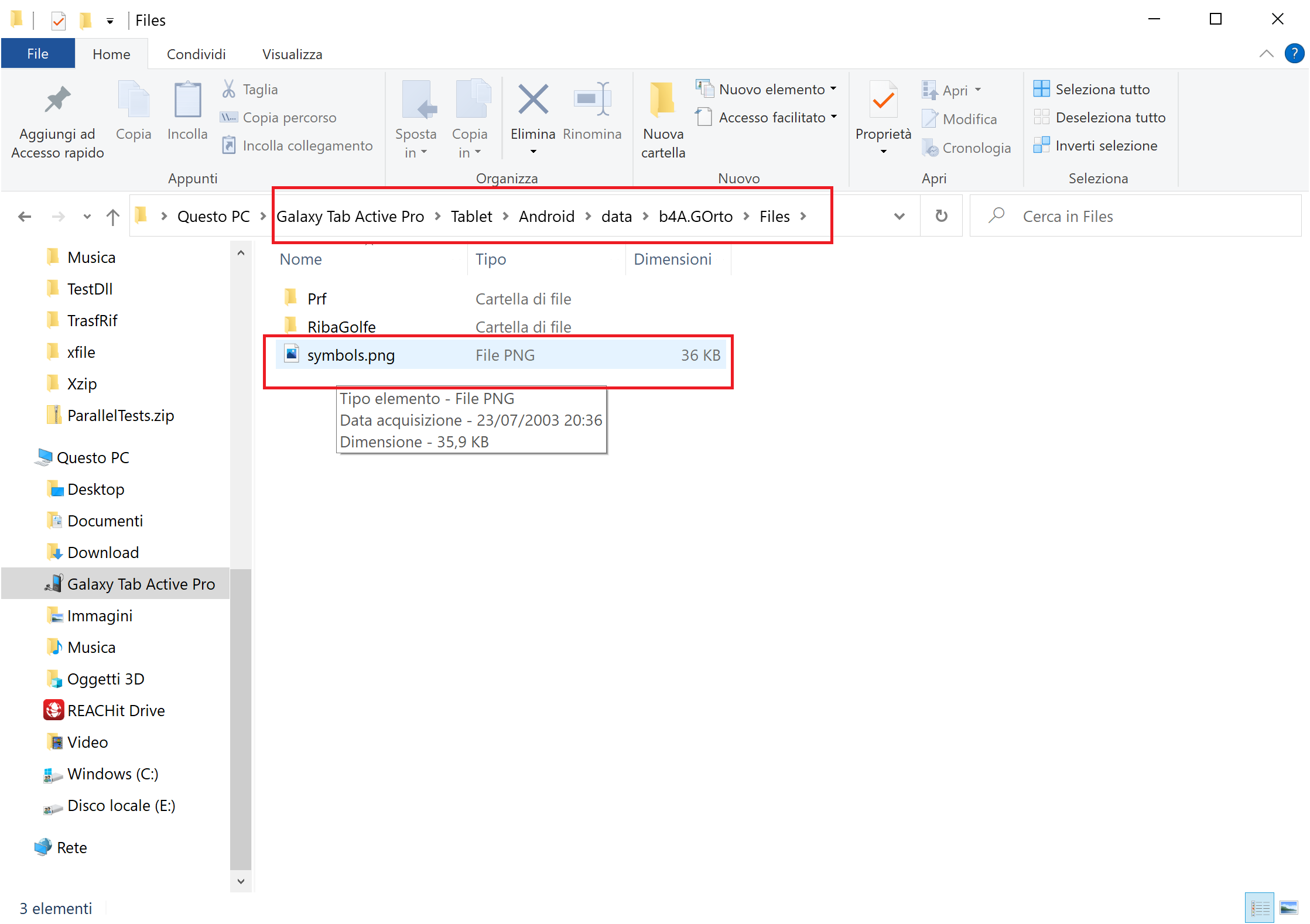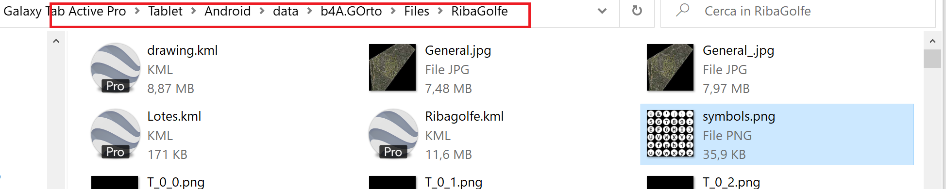 To test the situation, I have put the file "Symbols.png" either in Android/data/b4A.GOrto/files or in its subdirectory RibaGolfe, as shown in the pictures. Strangely (for me, of course) it claims not to find the file not in the "RibaGolfe" subdirectory, but in its parent, where it exists too, anyway..
