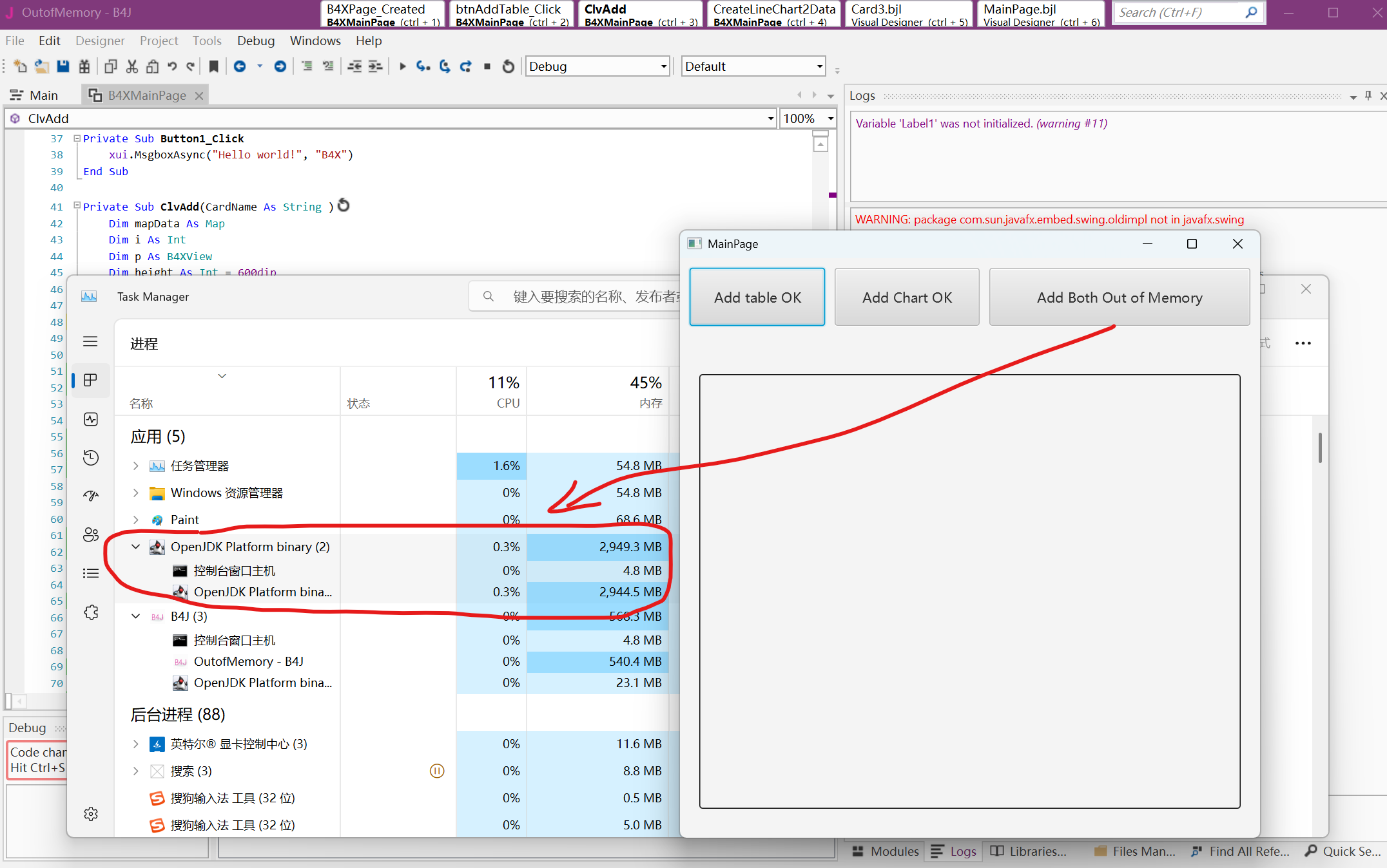 If B4XTable or xChart are added separately in the CustomiListView, there will be no error. If both B4XTable and xChart are added at the same time, there will be a memory overflow phenomenon.I cann't release objects. Perhaps my code was not written correctly,could anybody give me some advice to fix to the problem.