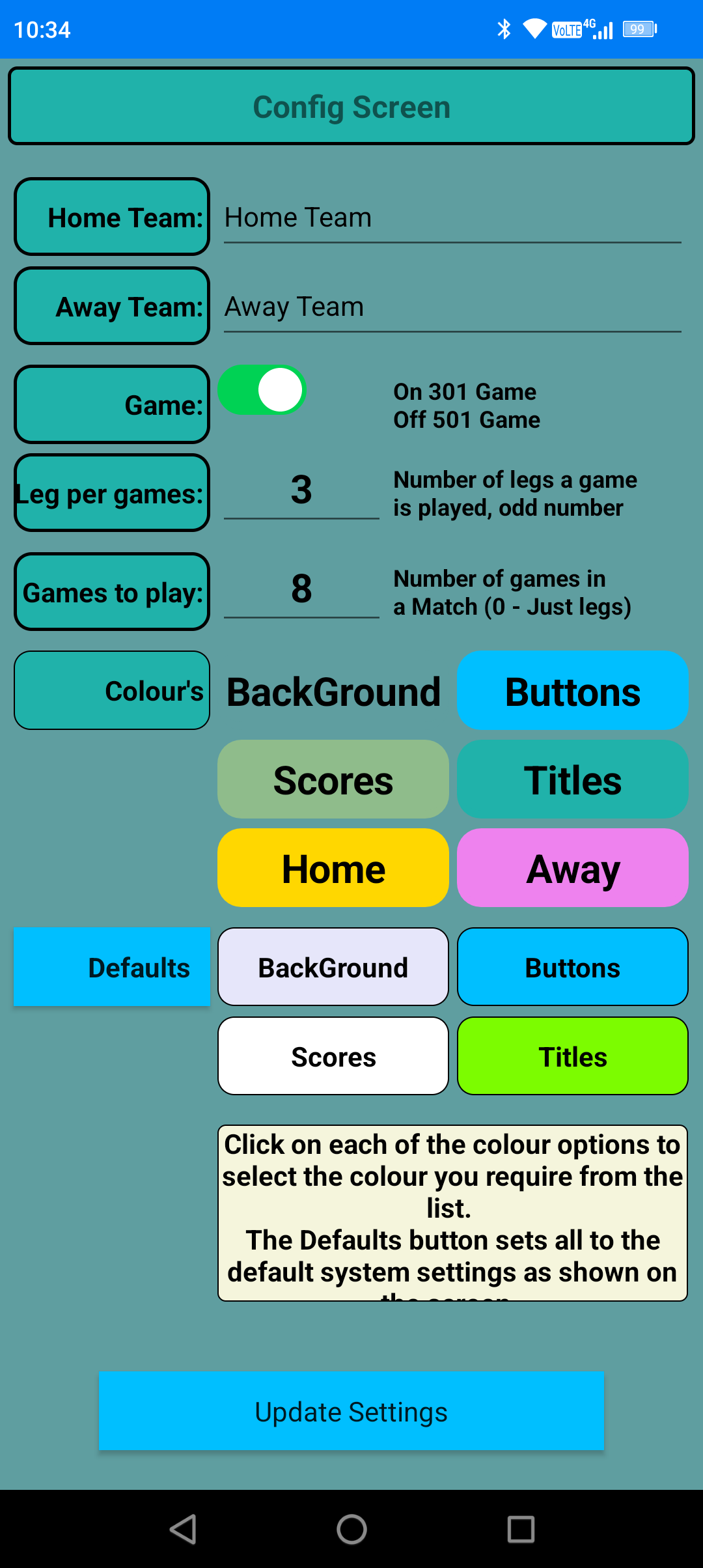 The scoreboard can be configured via the settings screen, changing team names, number of legs in a game and number of games in a match, screen colours and the type of game to be played, i.e. 301 or 501.