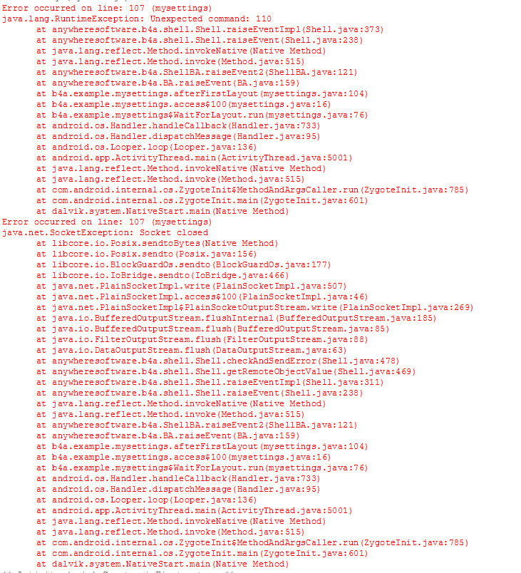 The location may vary however the line number always refers to an End Sub in my Activity and is always accompanied by the Unexpected command: 110 (Often 110 but it can vary). Commenting out my KVS routines (only using GetSimple and PutSimple) allows it to work normally. Also stepping quickly through with the debugger seems to work fairly reliably even with the KVS routines in place.