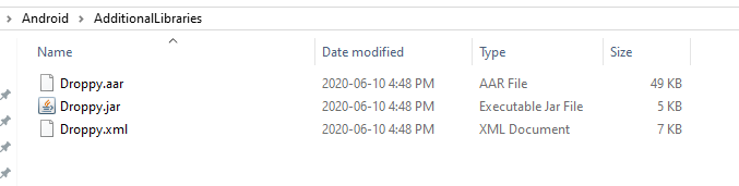 - Download the library zip and extract the three files to your additional libs folder. Droppy.xml/jar/aar