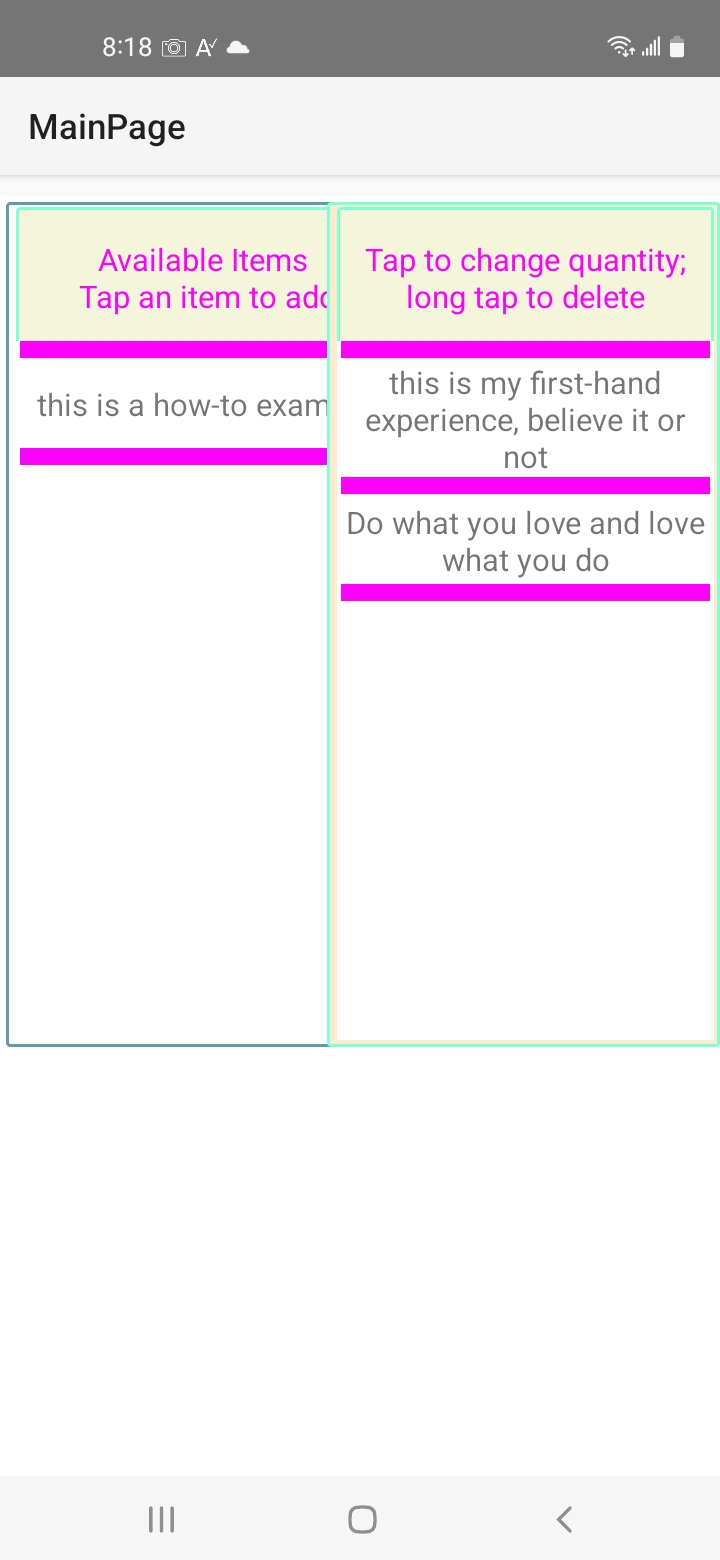 I want the screen to be split into left half and right half of equal width. Each side contains a label and customlistview.
