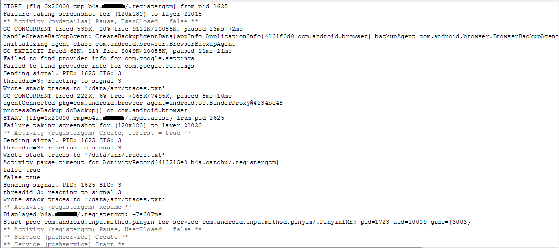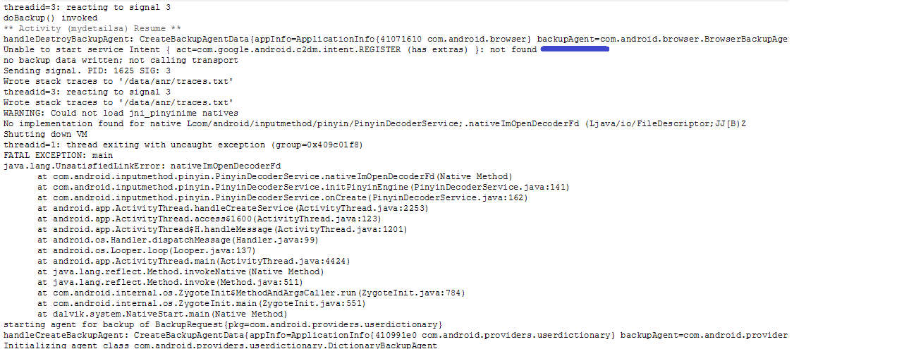 I note that after changing the Register Device code I now receive two "Unable to Start Intent" messages as well as a much longer log.