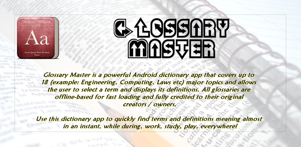 Glossary Master is a powerful Android dictionary app that covers up to 24 (example: Engineering, Computing, Laws etc) major topics and allows the user to select a term and displays its definitions (example: Balance - The amount of money remaining in an account.) All glossaries are offline-based for fast loading and fully credited to their original creators / owners.