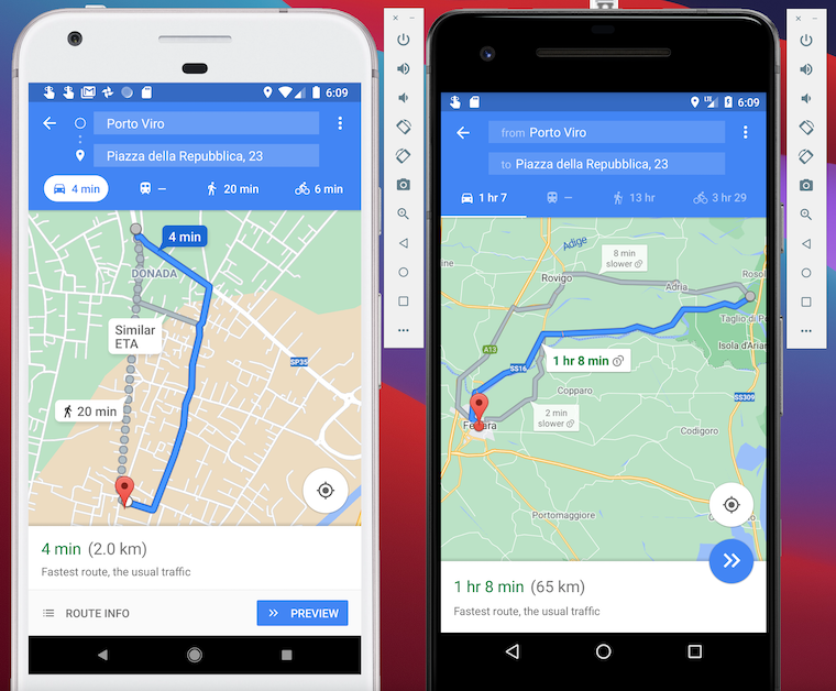 Sullo smartphone a sinistra (stessa identica app e stesso identico indirizzo di destinazione) dice che per andare da Saronno (VA) dove sono io attualmente a Porto Viro (RO) ci vogliono 4 minuti.