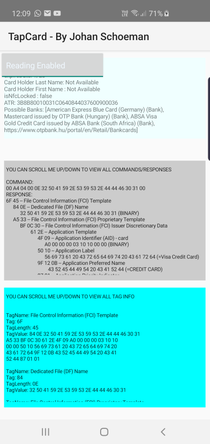 'note that there are numerous commands sent / responses received from a single card scan - the code below just adds to the empty string so that you can see the entire conversation