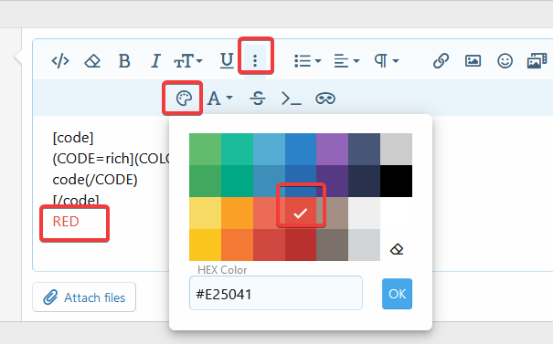 But in the part about Code Display the following example does not show correctly as RICH in the code is not shown in red (and is not shown as red here either, BUT is shown in red when the code tag is deactivated):