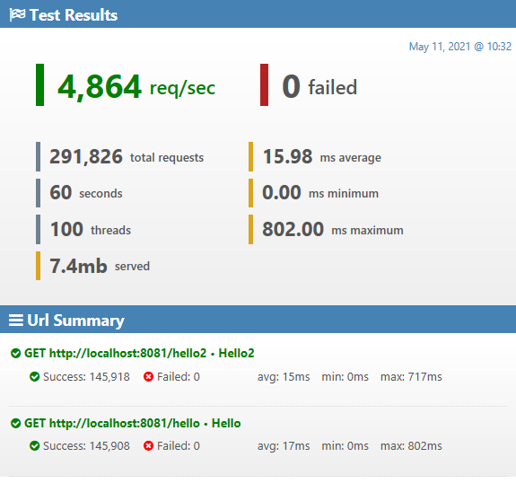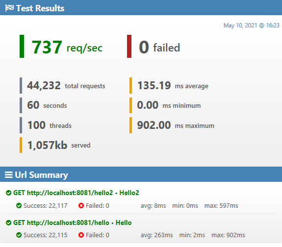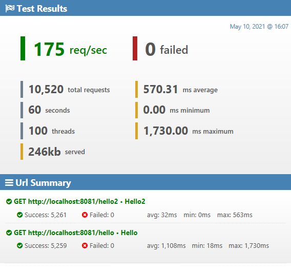 As you can see below there are no failed requests over 10k+ requests. I repeated this several times and can never get any errors. The SQLite database didnt even have WAL turned on initially. With WAL enabled the requests are much quicker and I get over 700 request per second, again with no failures.
