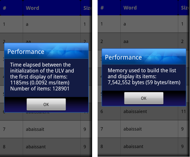 • It has a low memory footprint and is very fast (this report comes from the Performance demo where the list has to display 128901 distinct words read from a database and the used device is a Huawei Honor single core 1.4 Ghz):