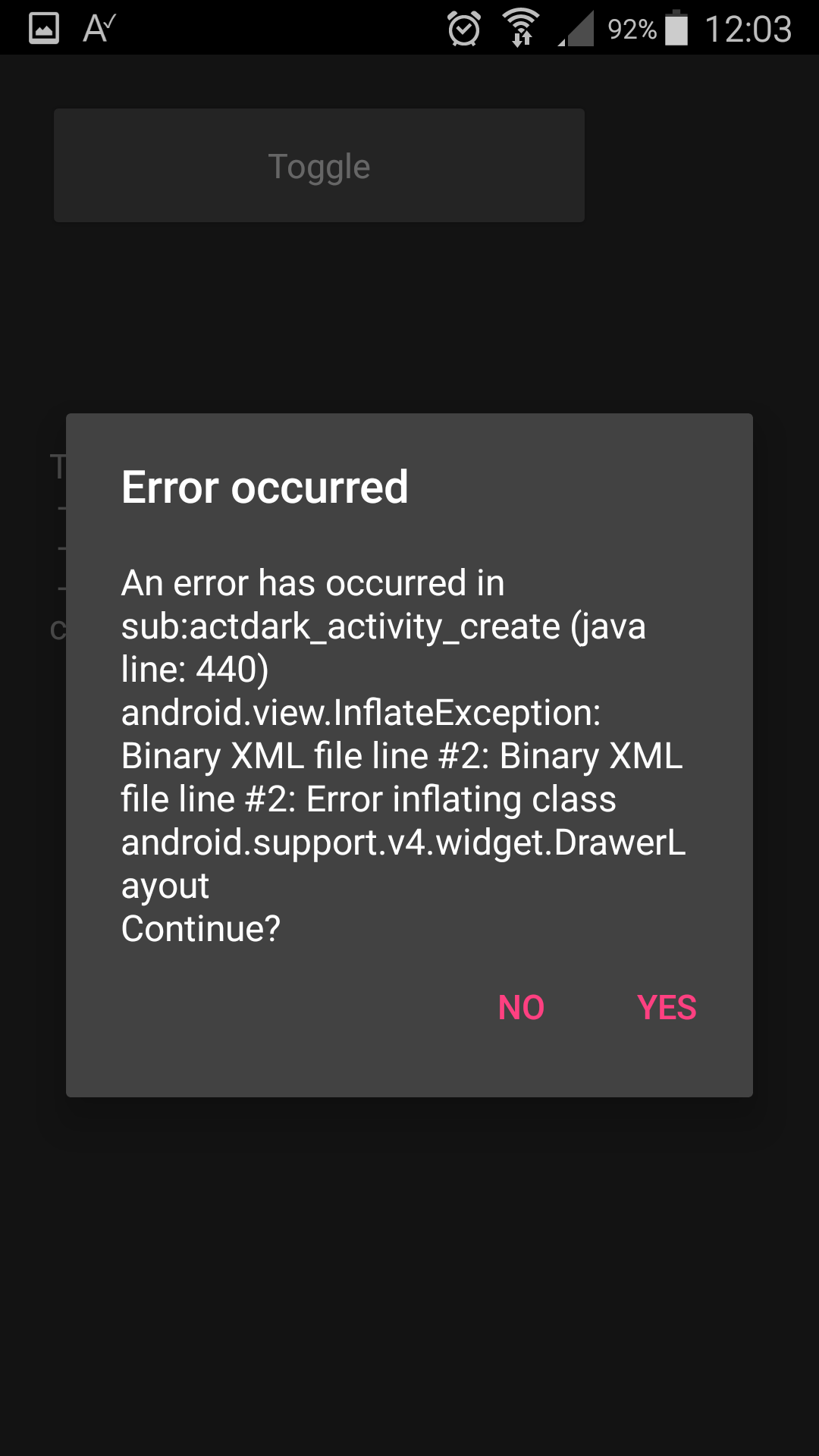 I followed all the driving and I was able to install the example on your smartphone, but when I click on "Dark Drawer" I get an error. I have attached a screenshot of the error. Where am I wrong?