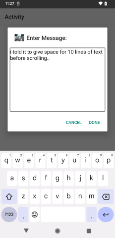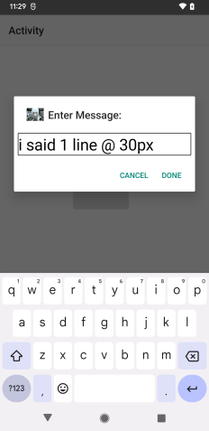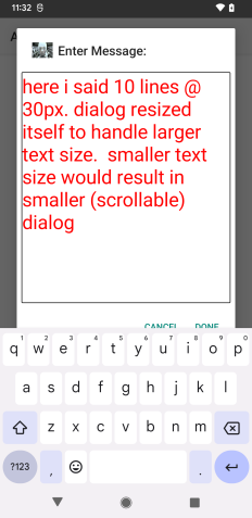 it seems to behave as expected. input area shrinks or expands in accordance with number of lines you expect and text size specified (if any). unzip attached archive and save the .jar and .xml files to your additional libraries folder, and select etdialog from the additional libraries tab in the ide. declare and initialize as per above. if you want an icon on your dialog, you need to load a bitmap in your app and pass it as per above. otherwise pass null when invoking your pop-up. i looked at a number of so-called "themes" before settling on 2: one dark, one light. default is light. set DarkTheme to true to activate it. i realize it's possible to implement something similar with an edittext on a transparent panel, but i didn't want buttons among other design headaches. i prefer the look of a pop-up.