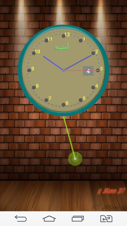 An analog clock with brick-wall background and transparent pendulum.. Download link is here.