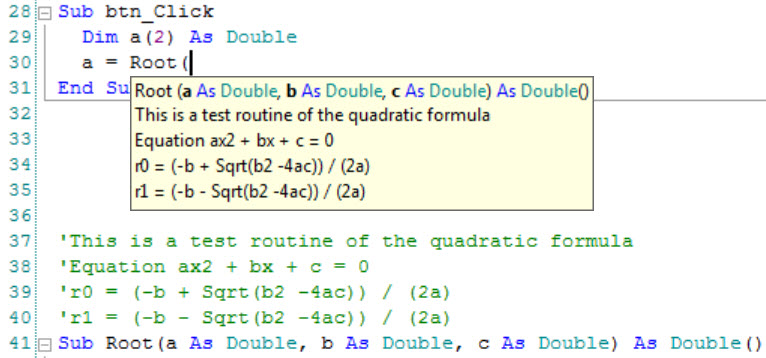 In the example code at line 30 a = Root add ( and you will see the help like in the attached picture.