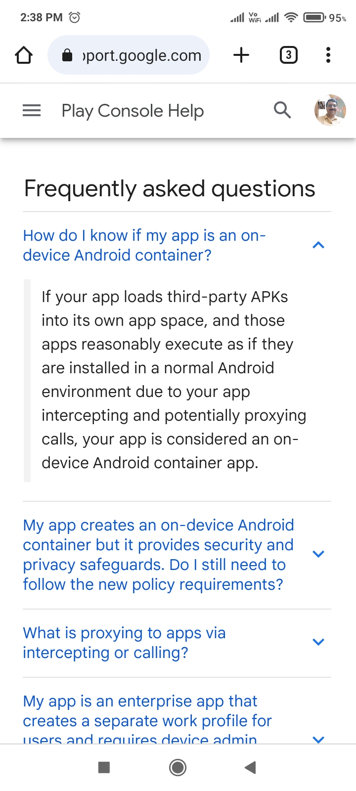 - To give developers more control over where their apps appear, we’re updating our Device and Network Abuse policy to state that all apps running On-device Android Containers, which simulate all or portions of the Android OS, must respect the new REQUIRE_SECURE_ENV flag. Apps can add this flag to their manifest to indicate they don't want to be run in an On-device Android Container.