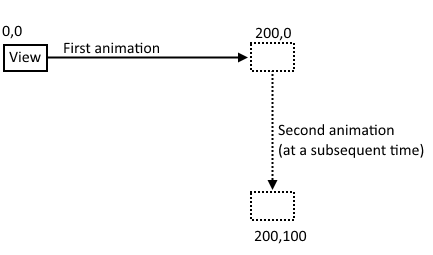 The label is animated moving to point X2, then the button is clicked. I want the label immediately jumps to X3 (no animation from X2 to X3). And then continue the animated moving from X3 to X10. How can I do this? Thanks.