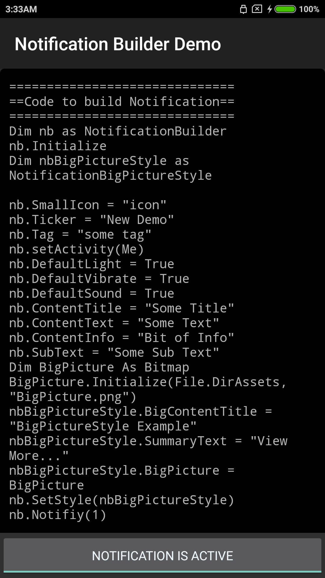 All previous notification objects (b4a's built in and both my previous libraries) use a, now, old standard notification object; And while it still works, new features are not supported. Also the 'number' stamp breaks on new versions of Android (HoneyComb+) why? Google changed their ways, now, instead of showing the number on the status bar icon, it is shown in the notification itself. Also, these newer versions support additional features like progress bars without custom layouts, a 3rd text element named Sub Text, a small text area that can replace the Number (Info Text). We can also hide the Time Stamp or even use it as a chronometer (JellyBean+). Check out the documentation below for a full list of currently supported features.