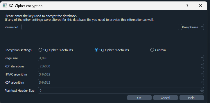 ✅ legacy=4: SQLCipher 4.x (uses 256000 KDF iterations, HMAC-SHA512, PBKDF2-HMAC-SHA512)