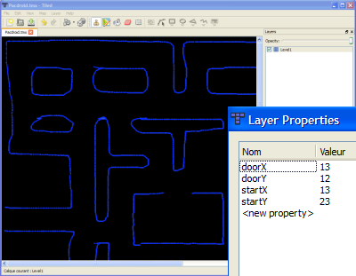 For the maze, I decide to make a tiled map, as in the original version. I construct a tile set by drawing over a screenshot, and then import it in Tiled to create the first level: