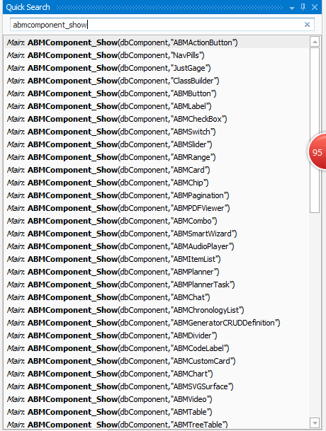Each ABMComponent is made up of properties, methods, events and perhaps some fields i.e. constants, you find most of these in the ABM.<field>.