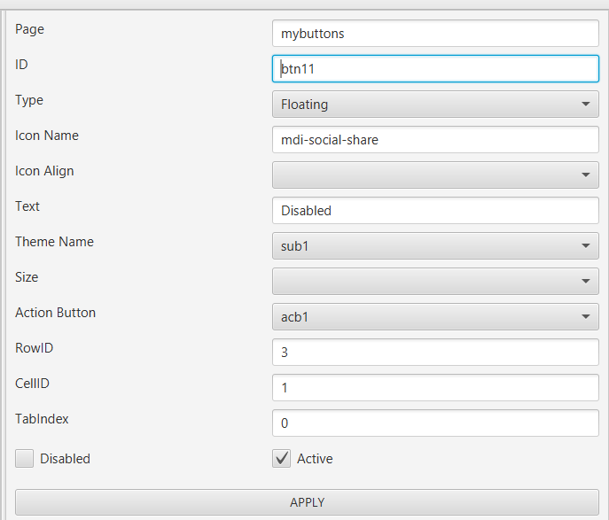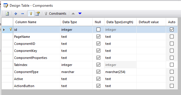 Wow, thank you so much. I really appreciate your advice and your interest in this baby of mine. I have been learning a lot from your ABMaterial concept and its a 'do as you go approach' for me currently. I learn about each component then design the builder based on what I understood and learned. I anticipated the flexibility as I was skimming through the components and saw similaries here and there and tried to adopt what I learned. As an example, the button builder, at first it was just a normal button, then a later had to link it to an actionbutton, so I chop and change as I go along. This is good, more specifically because the database structure that stores the component definitions is flexible. I dont have column names for each property, I store all the properties in a JSON string and read those back, making my backend flexible. I only store what's crucial out of that JSON. The attached image details the current design of my components table for example.