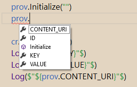 Log($"$time{Cursor.GetLong(prov.TIME)}: ${Cursor.GetInt(prov.ID)}: ${Cursor.GetString(prov.KEY)}:${Cursor.GetString(prov.USER)}: ${serializator.ConvertBytesToObject(Cursor.GetBlob(prov.VALUE))} "$ ) ' You can use the constants you used for the projection. But remember: only the ones you defined in the projection are available in the Result.