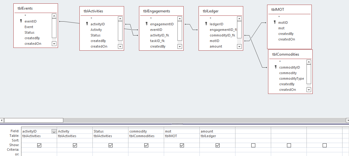Caused by: android.database.sqlite.SQLiteException: no such column: tblActivities.Activity (code 1): , while compiling: SELECT tblActivities.activityID, tblActivities.Activity, tblActivities.Status, tblCommodities.commodity, tblMOT.mot, tblLedger.amount FROM (((tblLedger INNER JOIN tblMOT ON tblLedger.motID = tblMOT.motID) INNER JOIN tblCommodities ON tblLedger.commodityID_fk = tblCommodities.commodityID) INNER JOIN (tblEngagements INNER JOIN tblActivities ON tblEngagements.activityID_fk = tblActivities.activityID) ON tblLedger.engagementID_fk = tblEngagements.engagementID) INNER JOIN tblEvents ON tblEngagements.eventID = 1