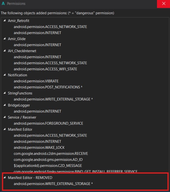 I have dangerous permission android.permission.WRITE_EXTERNAL_STORAGE * and in list permissions says it comes from a string function