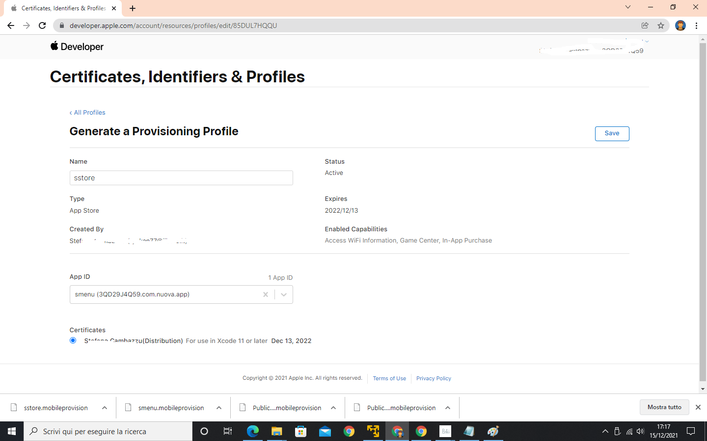 Ho registrato i certificati per la pubblicazione dello store li ho scaricati è ho aggiunto questo codice