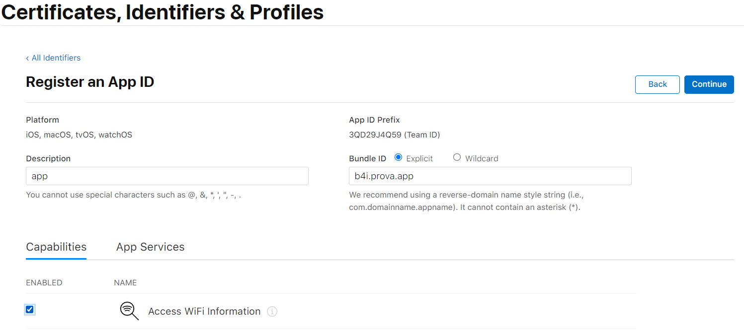 Non è stato trovato nessun record applicazione adatto. Verifica che l'identificatore bundle “com.xxxx.sxxx” sia corretto.