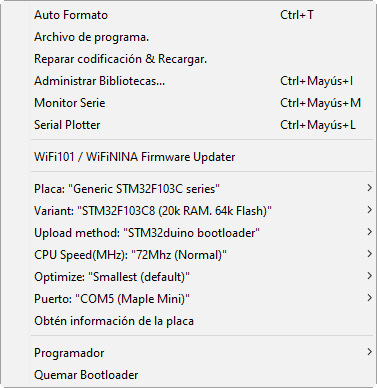 Aparte, después de grabar el código, termina dañando el Bootloader Maple, quedando como Maple DFU en el Administrador de dispositivos de Windows.
