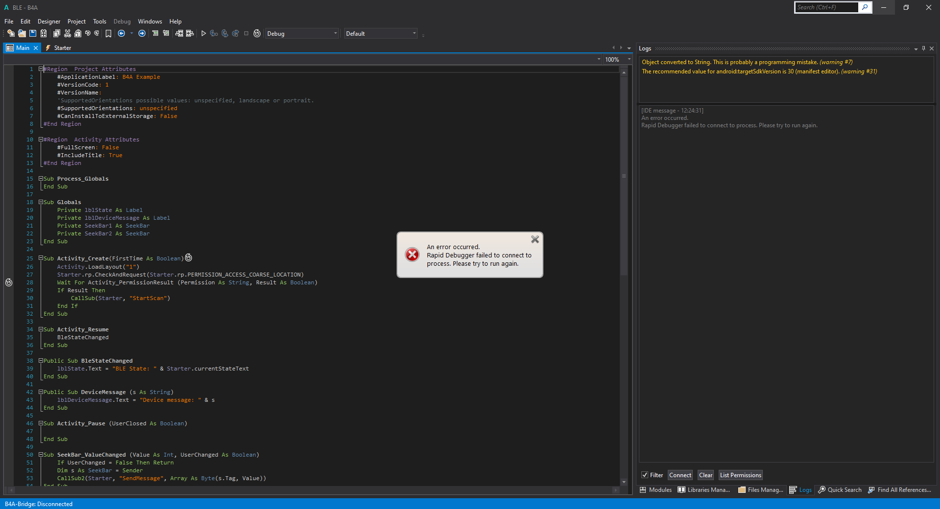 This library replaces the previous BLE library. It is simpler to use and it is more powerful. Its API is based on B4i iBLE library which makes it easy to reuse B4i code. See the iBLE tutorial: https://www.b4x.com/android/forum/threads/ble-bluetooth-low-energy-library.46099/#content Tips &...