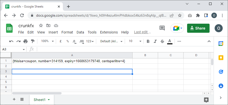 The coupon text / number / code / JSON is in a shared read-only Google Sheets spreadsheet eg: