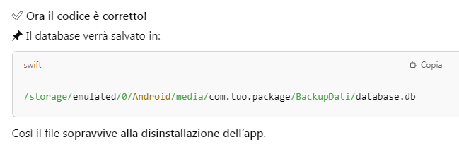 Ho collegato il telefono al pc tramite cavo usb e ho notato che, fino a quando l'applicazione é installata sul telefono, il database si aggiorna correttamente e rimane visibile nella cartella all'interno del telefono stesso. Se disinstallo l'applicazione sparisce tutto e buonanotte suonatori, per cui fino a qui non é difficile capire che c'è un problema di conservazione dei dati nel momento in cui disinstallo l'app ed é per questo che mi chiedo: come posso evitare che il database sparisca quando la disinstallo? È forse una clausola di Google? Se sì, come fare per implementare l'opzione senza dover utilizzare la riga di codice sull' Editor Manifest: android:hasFragileUserData="true" che ti dà la possibilità di scegliere se conservare i dati oppure no, come per esempio succede con Whatsapp, ma che ti costringe a fare la scelta? Mi piacerebbe capire come fare senza dover far intervenire l'utente.