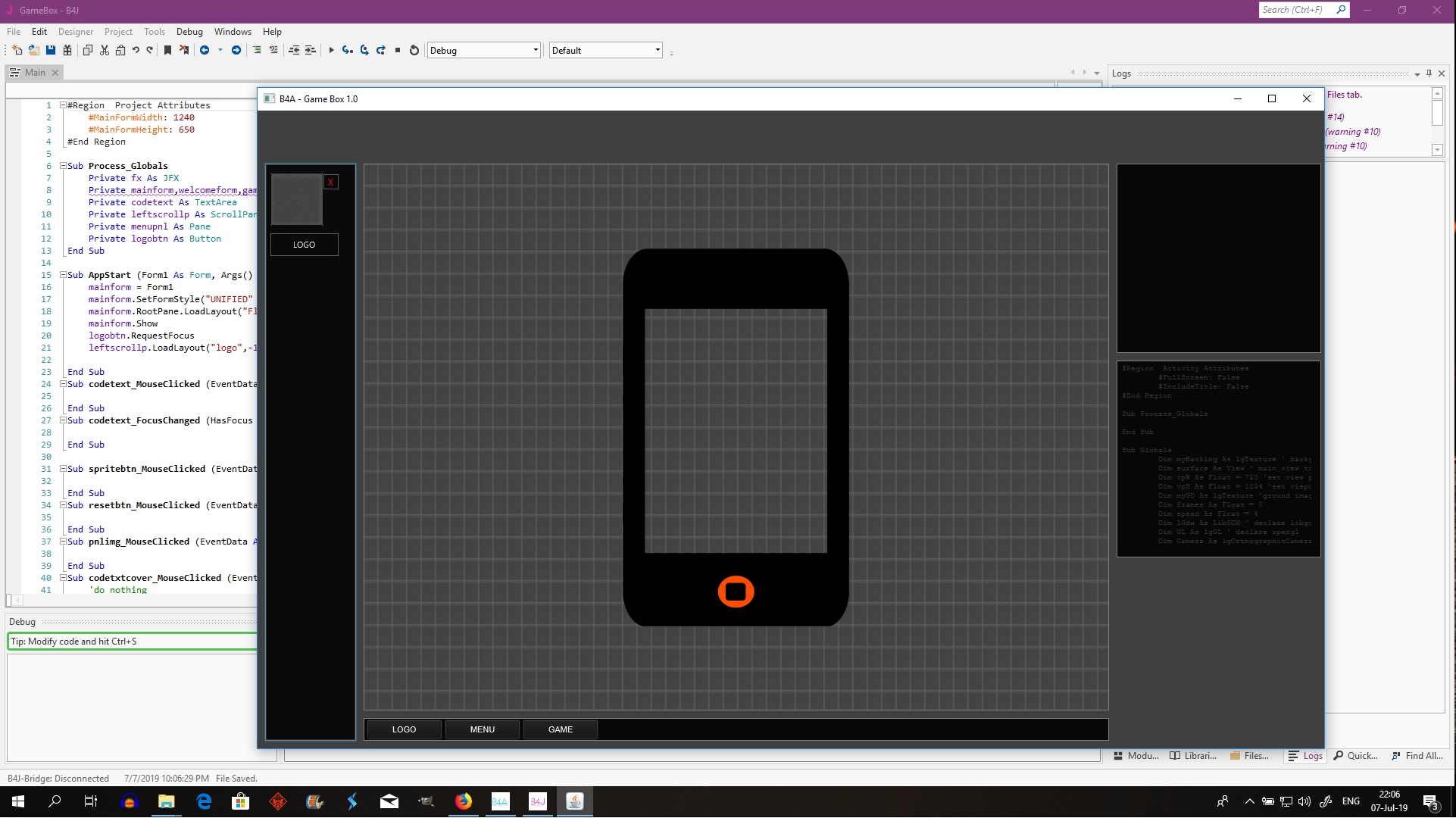 When you want to create an activity for Android or a form with B4J, you use the designer. Then see this tool as a designer for games. The idea is to be able to represent the different parts of the game on the screen, without coding anything, knowing that the result will be similar in the application. It is also to be able to test the physical part with Box2D so that you can make adjustments without waiting until you have coded this part. If you work in a team with someone who is not a programmer, you will quickly understand the usefulness of this tool (it avoids countless and tedious back and forth between someone who works with Photoshop or Tiled, and you the developer).