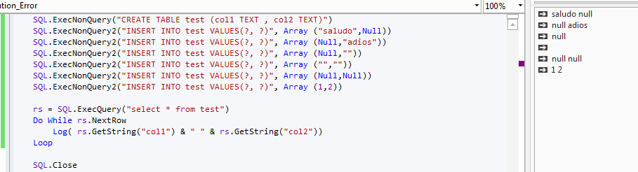 Si Las variables las pongo en la setencia SQL y no es null no hay problema pero si son null, o bien se almacena la palabra Null como string o si no lo pongo entre comillas al no ser valores numéricos también da error.