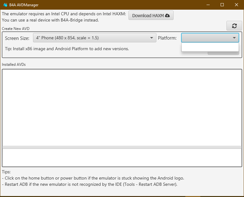 But at times I need the emulator (phone not available, need to check on tablet size or big phone size). Now when I start avd manager in B4A 10.6, I get below error,