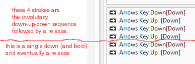 Press and hold almost every time gives me Down, Up, Down .... (for how long as I hold key) then Up