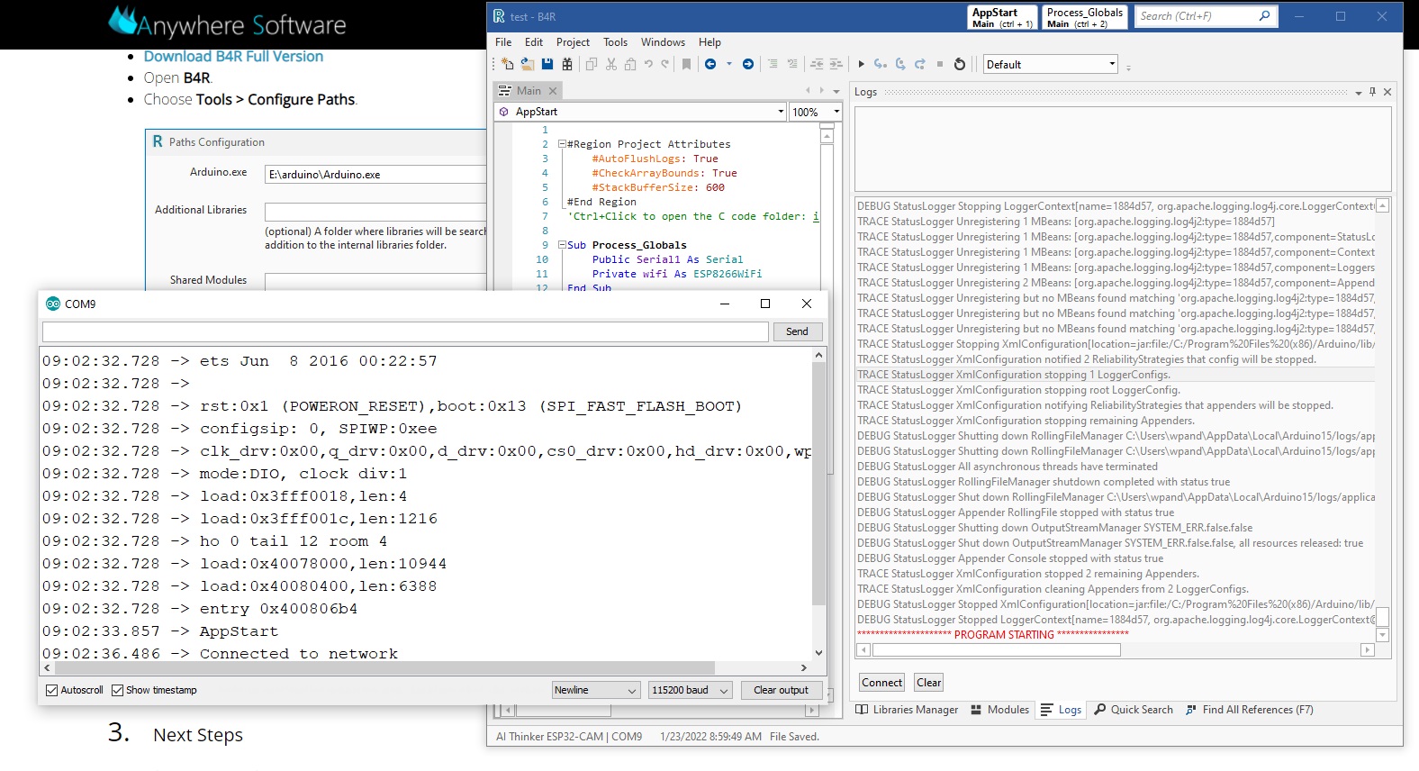 Any ideas on the two problems ("camera initialization" and especially "seeing logs in B4R") are highly welcomed.
