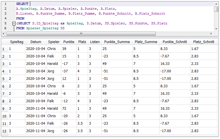 (SELECT S.ID_Spieltag as Spieltag, S.Datum, SS.Spieler, SS.Punkte, SS.Platz
