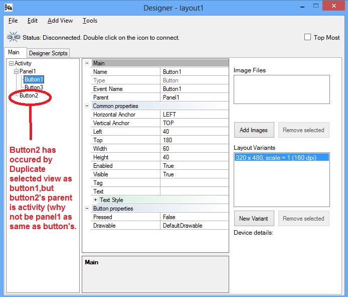 2. In designer,button2's parent is activity isn't panel1 as same as button's parent.