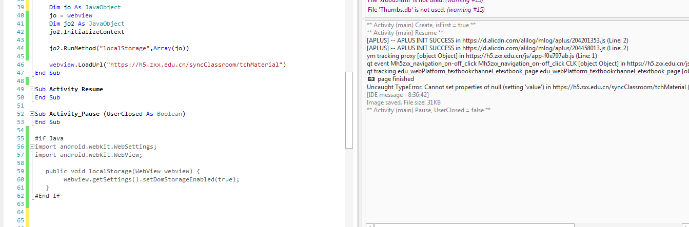 https://h5.zxx.edu.cn/js/app-f0e797ab.js, there are a number of references to localStorage in connection with the "getItem()" method that throws the errors mentioned above. localStorage is supported in chrome browser, but you have to turn this capability on in webview (settings.setDomStorageEnabled(true)