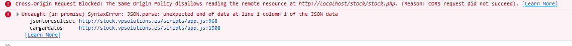 So you get a CORS error (cross origin) and hence afterwards a JSON error as it did not get back the expected result. I never use BANano with PHP as B4J has an excellent jServer itself, but I would suspect you will have to link to something like http://stock.vpsolutions.es/stock/stock.php to avoid the CORS error (or something to avoid having to use localhost).